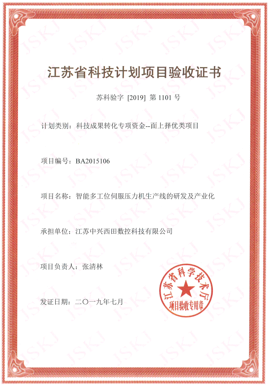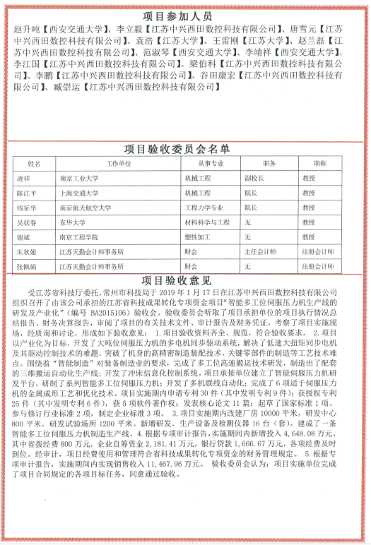 企業(yè)品牌知名度在行業(yè)內(nèi)不斷提升,獲批國(guó)家高新技術(shù)企業(yè),建有江蘇省博士后創(chuàng)新實(shí)踐基地、江蘇省企業(yè)研究生工作站(優(yōu)秀)、江蘇省智能伺服鍛壓裝備及工藝工程技術(shù)研究中心、江蘇省智能伺服鍛壓裝備系統(tǒng)工程中心、江蘇省工業(yè)企業(yè)技術(shù)中心、江蘇省工業(yè)設(shè)計(jì)中心,也是國(guó)家火炬計(jì)劃項(xiàng)目、江蘇省科技成果轉(zhuǎn)化項(xiàng)目承擔(dān)單位,是中國(guó)鍛壓協(xié)會(huì)副理事長(zhǎng)單位、江蘇省創(chuàng)新創(chuàng)業(yè)促進(jìn)會(huì)雙創(chuàng)人才分會(huì)副會(huì)長(zhǎng)單位。興鍛產(chǎn)品獲得江蘇省重點(diǎn)推廣應(yīng)用新技術(shù)新產(chǎn)品,江蘇省首臺(tái)(套)重大裝備產(chǎn)品、江蘇省高新技術(shù)產(chǎn)品,江蘇省科學(xué)技術(shù)進(jìn)度三等獎(jiǎng)。主持并驗(yàn)收了江蘇省重大成果轉(zhuǎn)化項(xiàng)目《智能多工位伺服壓力機(jī)生產(chǎn)線的研發(fā)及產(chǎn)業(yè)化項(xiàng)目》(BA2015106)、國(guó)家火炬計(jì)劃示范項(xiàng)目《伺服壓力機(jī)生產(chǎn)線的研發(fā)及產(chǎn)業(yè)化》(2015GH040862),江蘇省高端趕超工程項(xiàng)目。清單和證明如下:
